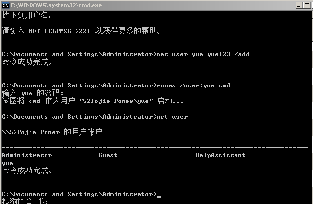 1.在windows xp系统中使用 net user yue yue123 /add添加用户yue,密码yue123的账户(用户名和密码可以自己设定);并使用net user命令确定用户添加成功。