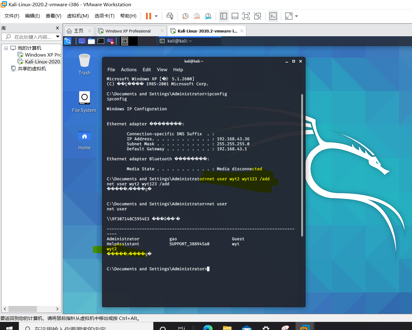 在shell中,利用net user 用户名 密码 /add ,添加一个用户,并在受害者的机器中使用 net user 命令进行验证。(需要截图)