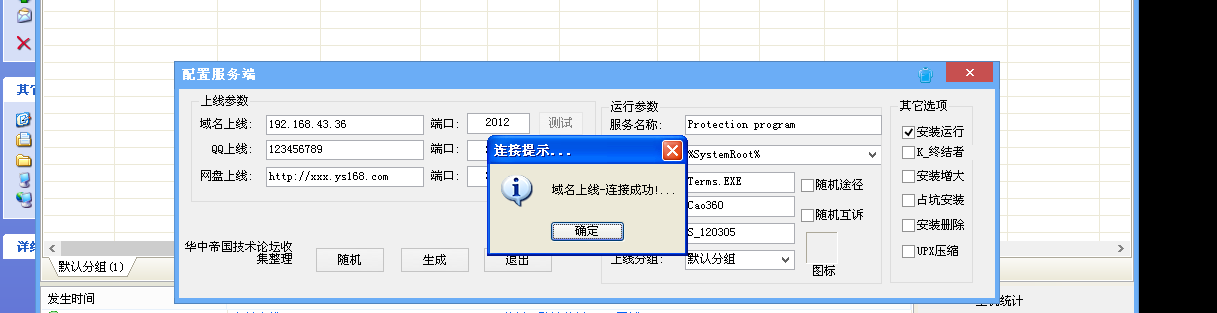 点击菜单栏中的“服务生成”,在弹出的配置服务端中,配置回连IP地址(攻击者IP)和端口号,并点击“生成”按钮,生成木马服务端。