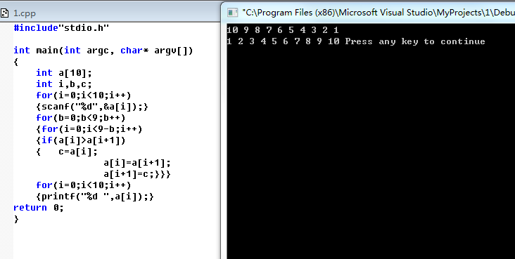 #include"stdio.h" int main(int argc, char* argv[]) { int a[10]; int i,b,c; for(i=0;i<10;i++) {scanf("%d",&a[i]);} for(b=0;b<9;b++) {for(i=0;i<9-b;i++) {if(a[i]>a[i+1]) { c=a[i]; a[i]=a[i+1]; a[i+1]=c;}}} for(i=0;i<10;i++) {printf("%d ",a[i]);} return 0; }