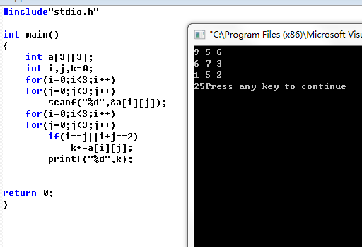 #include"stdio.h" int main() { int a[3][3]; int i,j,k=0; for(i=0;i<3;i++) for(j=0;j<3;j++) scanf("%d",&a[i][j]); for(i=0;i<3;i++) for(j=0;j<3;j++) if(i==j||i+j==2) k+=a[i][j]; printf("%d",k); return 0; }