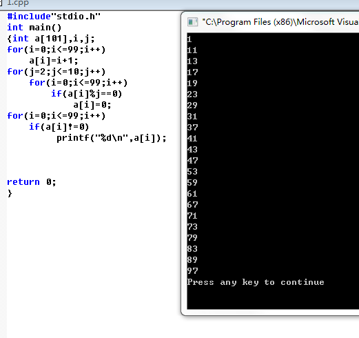 #include"stdio.h" int main() {int a[101],i,j; for(i=0;i<=99;i++) a[i]=i+1; for(j=2;j<=10;j++) for(i=0;i<=99;i++) if(a[i]%j==0) a[i]=0; for(i=0;i<=99;i++) if(a[i]!=0) printf("%d\n",a[i]); return 0; }