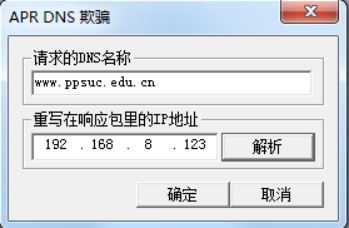 欺骗成功后,在被害机器上查看www.ppsuc.edu.cn的IP 查看是否被解析到了,指定的IP地址上。