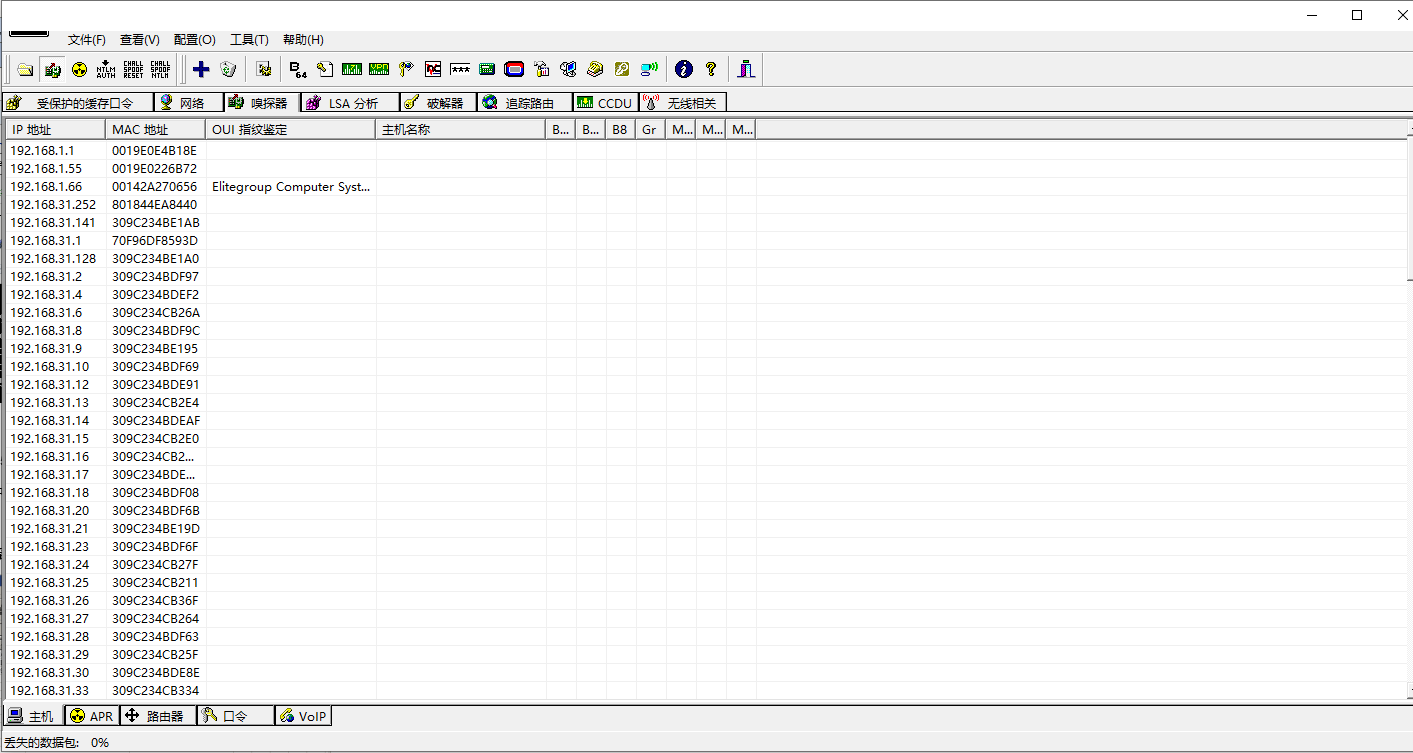 由图易知,在目的主机A中,192.168.31.1和192.168.31.246的MAC地址一致,欺骗成功。(cain的欺骗是双向的,故在192.168.31.1处也是如此)