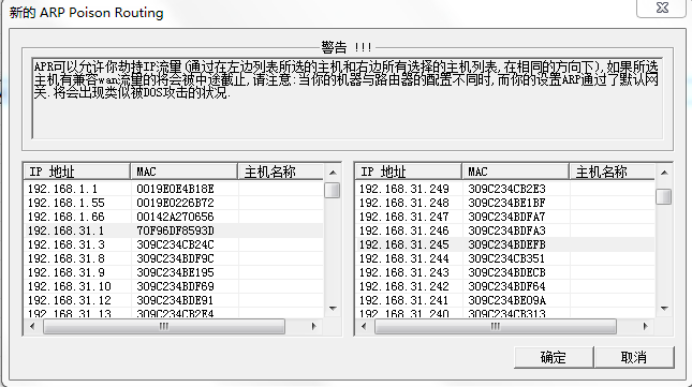 4、点击工具栏第三个图标(start ARP)就可以ARP欺骗了