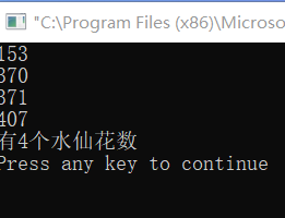 #include <stdio.h> int main() { int a,b,c,d,e=0; for(a=100;a<1000;a++) { b=a/100; c=(a-100*b)/10; d=a%10; if(a==b*b*b+c*c*c+d*d*d) { printf("%d\n",a); e++; } } printf("有%d个水仙花数\n",e); return 0; }