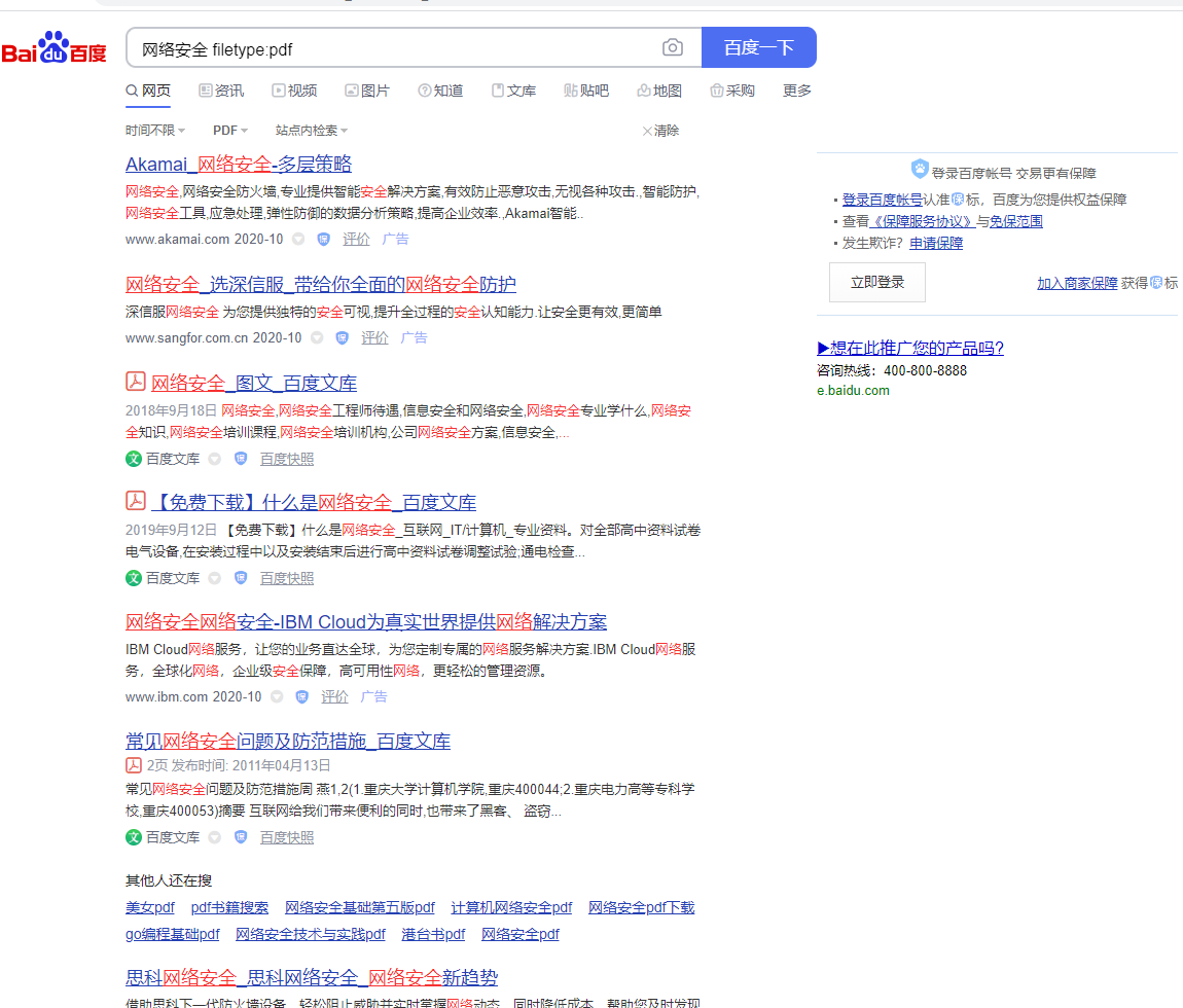 用百度或google搜索所有包含“网络安全”的pdf文档(附截图)