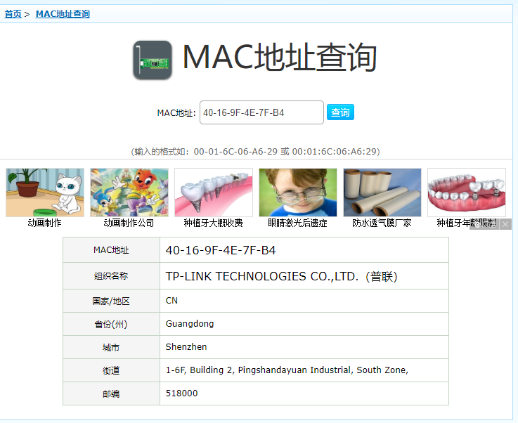 在一个案件中,获取了犯罪嫌疑人的一个MAC地址:40-16-9F-4E-7F-B4,请查询该MAC地址对应的厂商是(附截图)