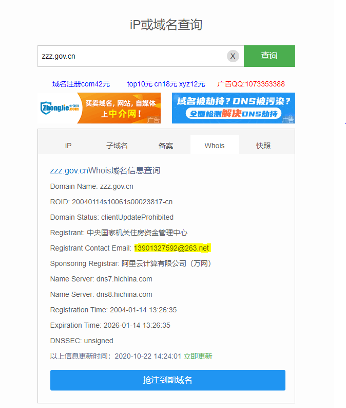 获取www.zzz.gov.cn域名注册时,注册人的邮箱是(附截图)