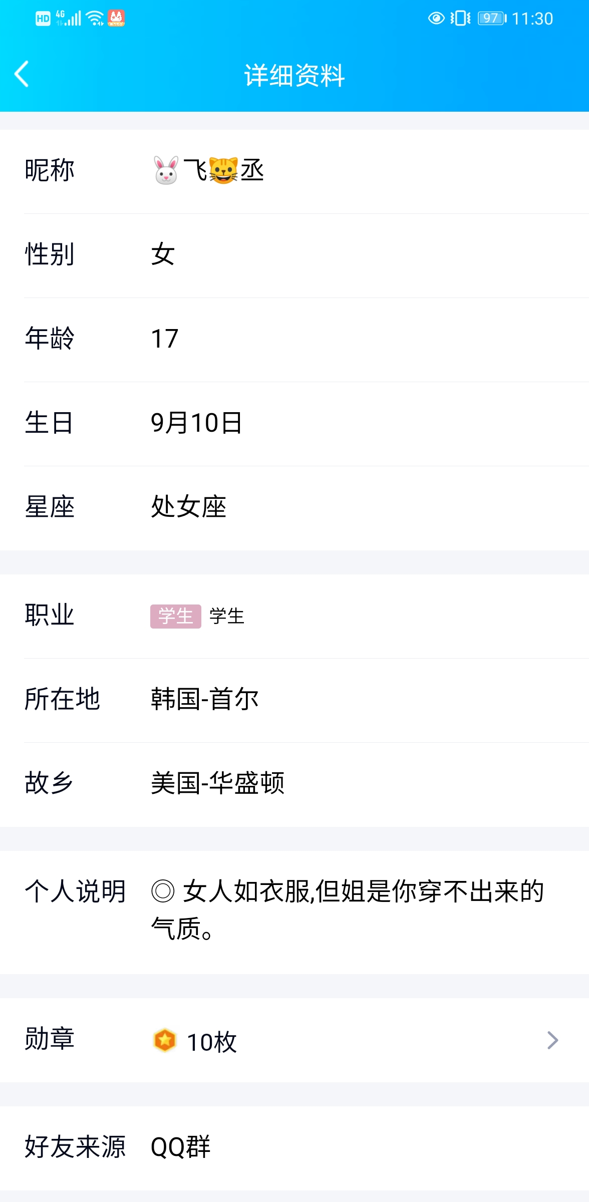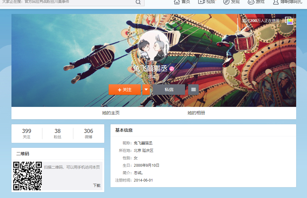 在微博上搜兔飞猫丞,找到资料卡中生日是9月10日的,发现她是20岁,来自北京延庆