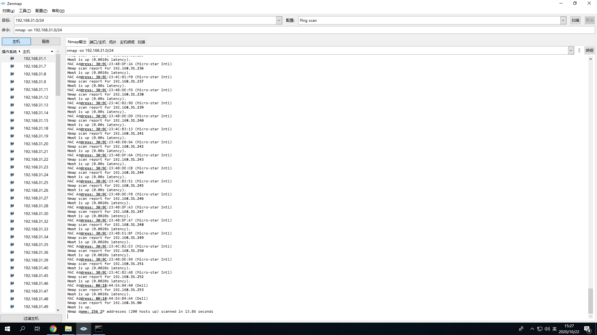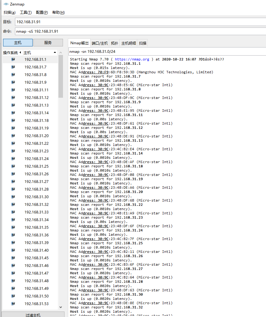 请查询本机的IP地址和子网掩码,并在局域网中扫描本网段内的所有存活主机(附截图)