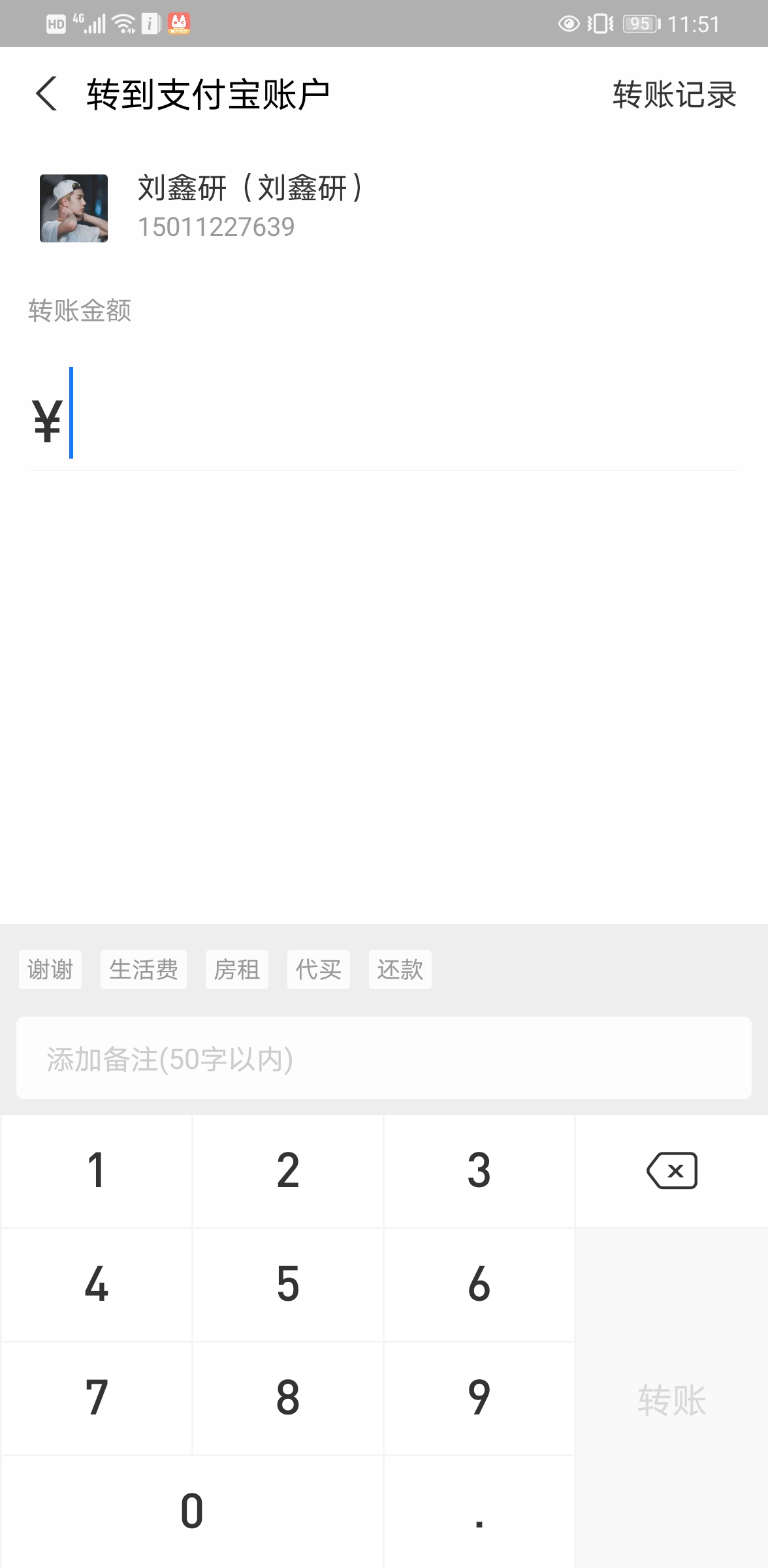 利用支付宝的转账界面,输入需要转账人的手机号15011227639,查询到手机号对应人的姓名是刘鑫研