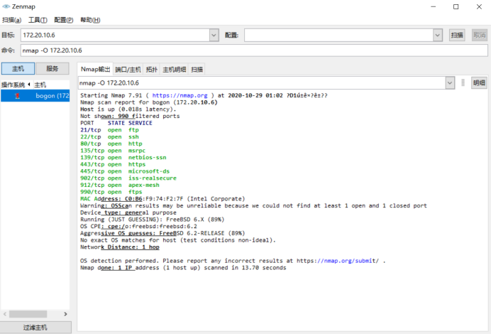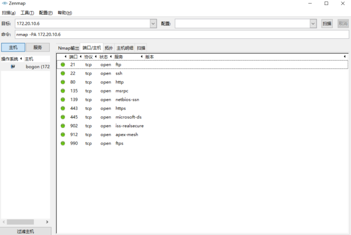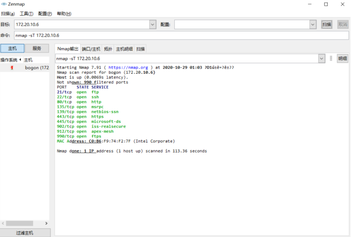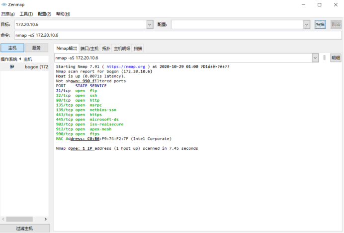 由于回答前面的问题时使用的是自己的电脑,此问题在实验楼电脑上重新安装zenmap,进行扫描: