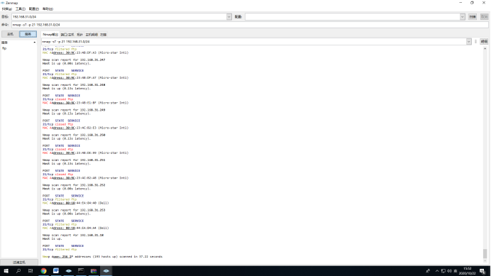 在实验楼上网的局域网内,请扫描出来,哪些机器开启了ftp服务,哪些机器开启了远程桌面连接服务,并附截图证明。