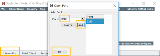 点击Listen Port,在弹出的对话框中输入端口号,并点击Add按钮,最后点击OK,成功监听本地端口。【本过程选用3210端口,实验过程大家可以自己选择端口】