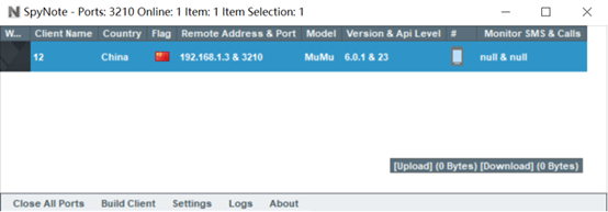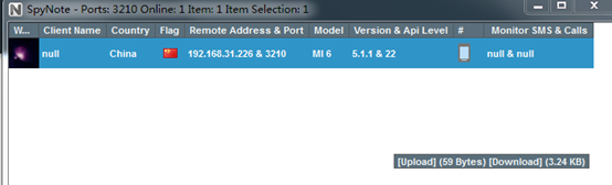 可以在spynote中看到有一台机器上线,并可以查看其基本信息。