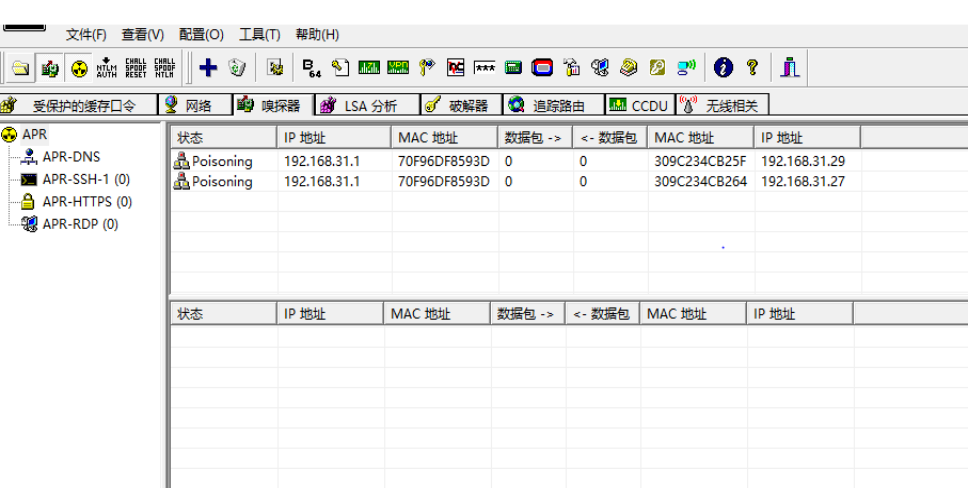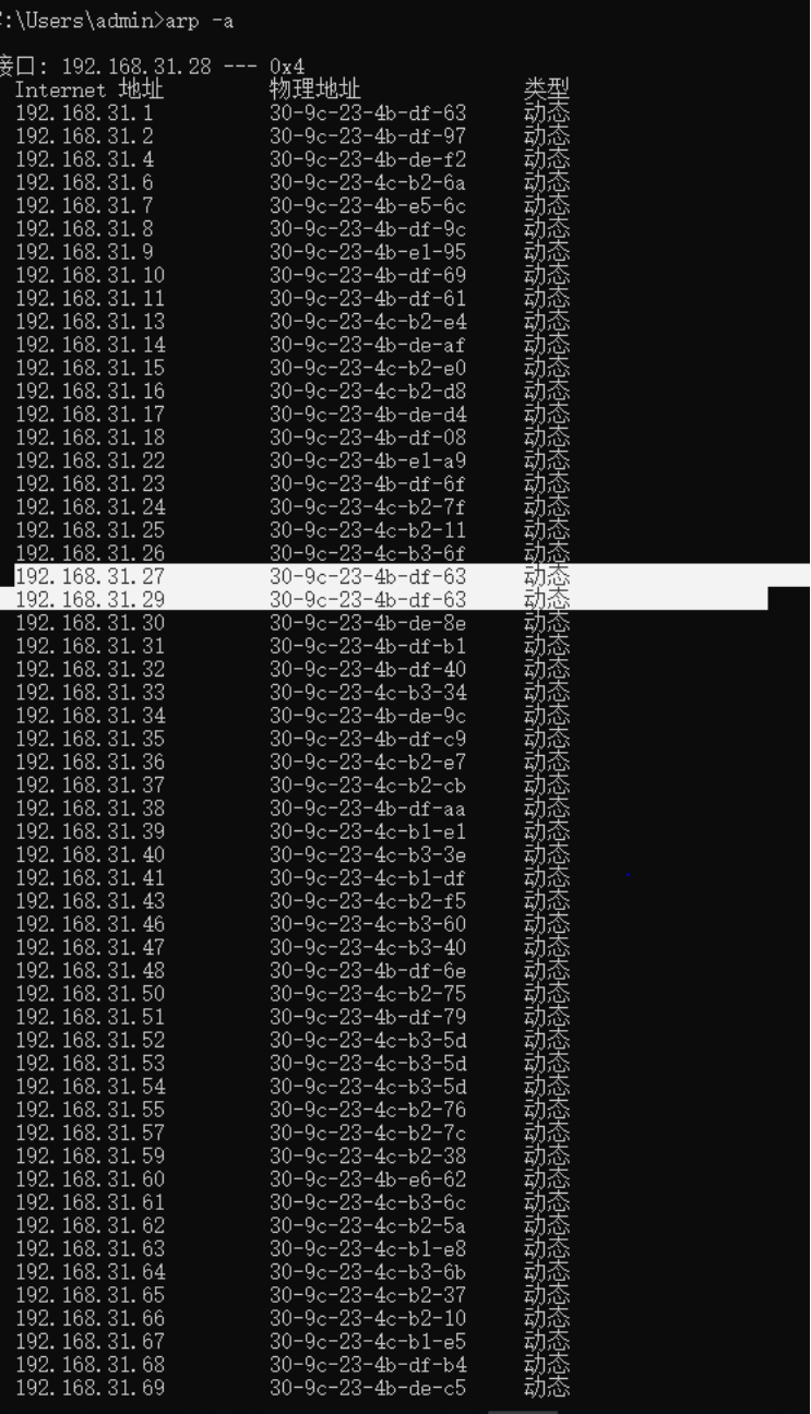 对192.168.31.29(30-9c-23-4c-b2-5f)和192.168.31.27(30-9c-23-4c-b2-64)并对其进行欺骗