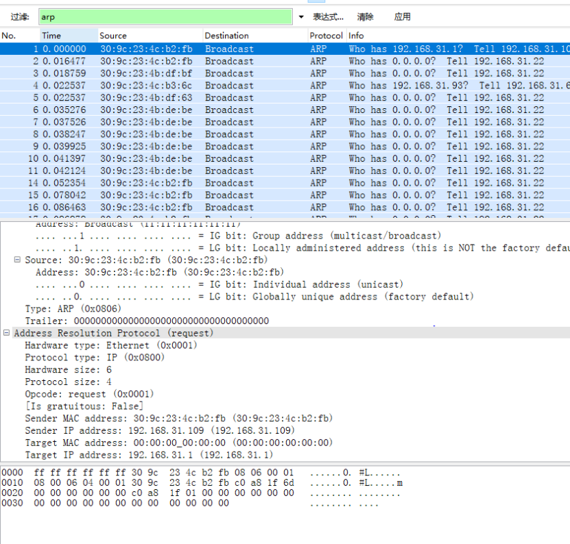 3.欺骗过程中,在主机A开启Wireshark进行抓包,分析APR欺骗攻击过程中的数据包特点。(附截图)