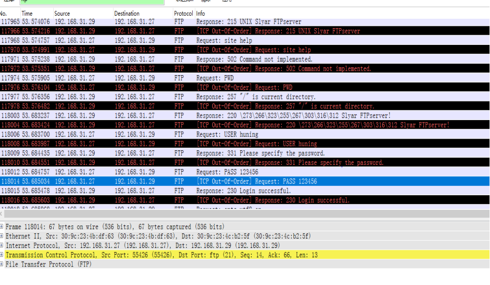 4.欺骗过程中,在主机C开启Wireshark进行抓包,分析FTP协议的登录过程(附流程图)