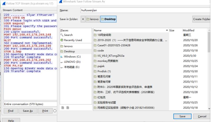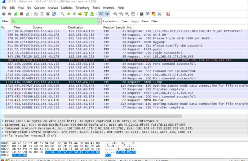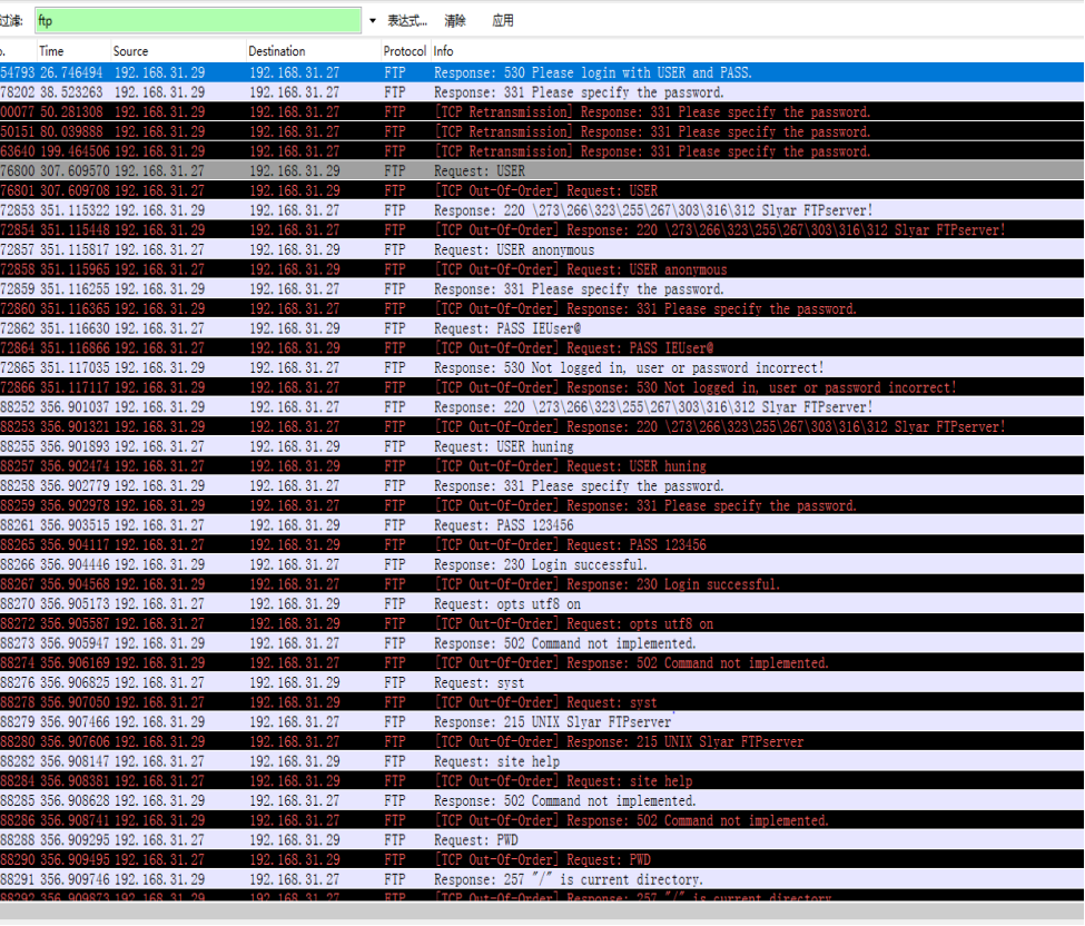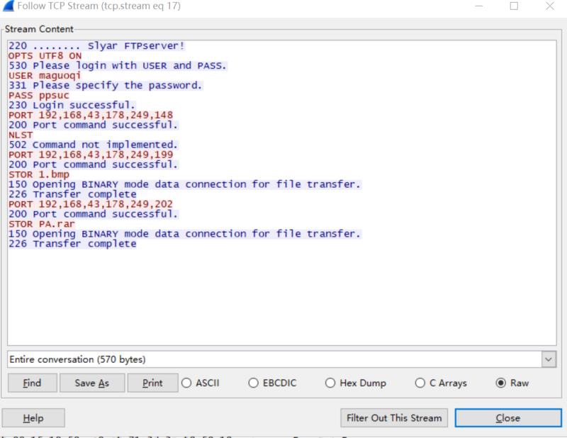 4.B同学停止Wireshark抓包,并和A同学一起分析数据包中的FTP登录过程,还原登录用户名和密码,以及上传文件。