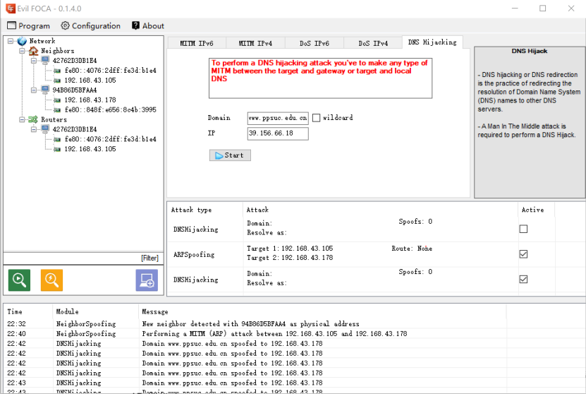 3.B同学扮演攻击者,设计攻击方法,使用CAIN,通过DNS欺骗的方式,让A同学访问www.ppsuc.edu.cn网址的时候,访问到另外一台机器上的伪造网站