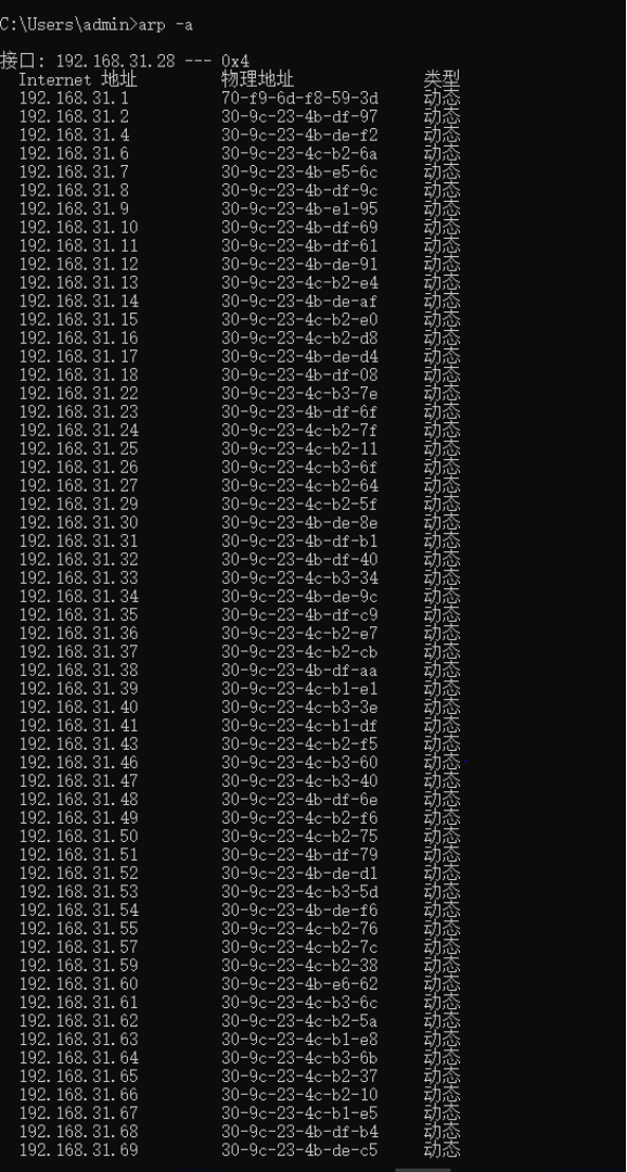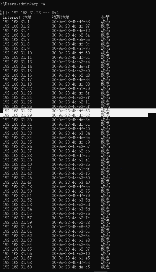欺骗攻击后相关的IP地址对应的MAC地址如下图所示