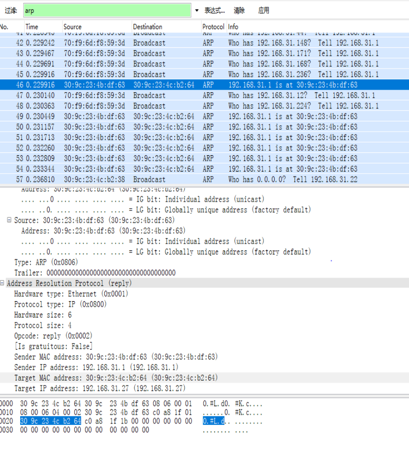 (4)ARP欺骗的数据包同时也可以被其他在同一个网段的主机查询到。例如我们可以查询到192.168.31.93的主机被192.168.31.6的主机查询等,之后再可根据MAC地址追踪到对应的主机。