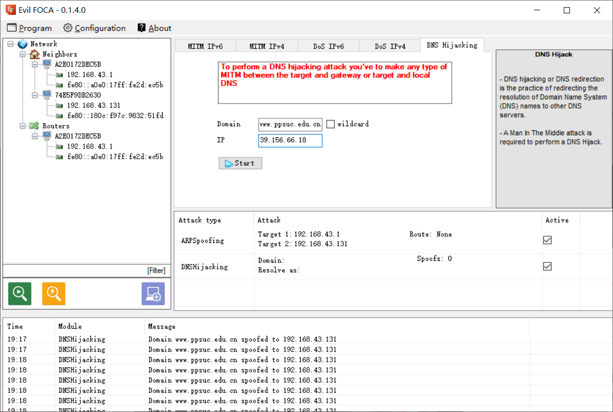 由于CAIN软件在本地局域网无法使用,遂使用的为EvilFoca软件