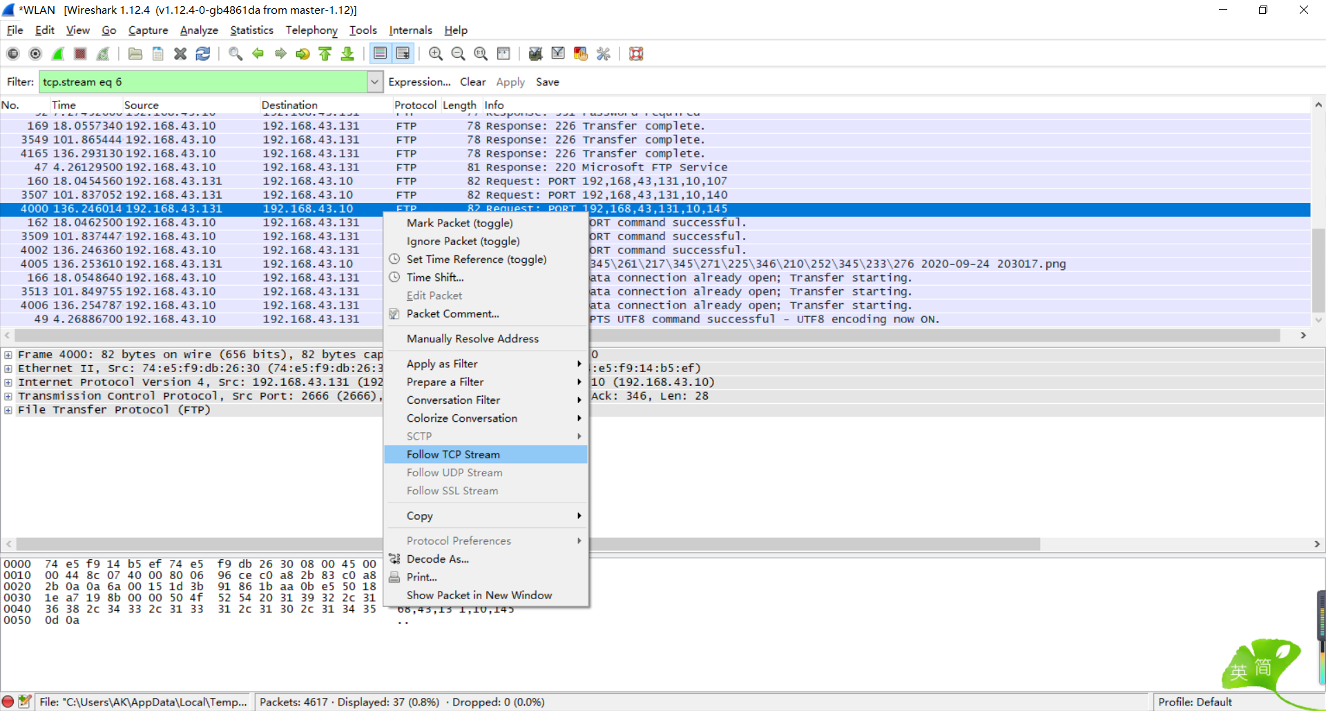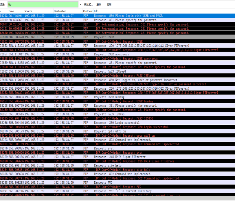 4.B同学停止Wireshark抓包,并和A同学一起分析数据包中的FTP登录过程,还原登录用户名和密码,以及上传文件。