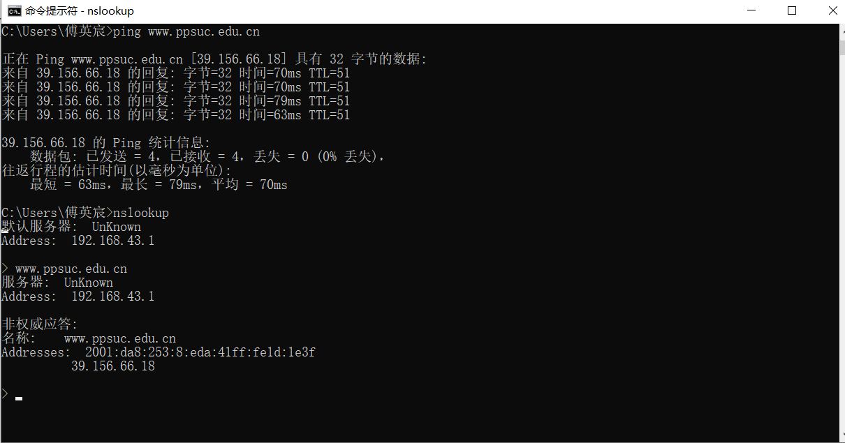 欺骗成功后,在被害机器上查看www.ppsuc.edu.cn的IP 查看是否被解析到了,指定的IP地址上。
