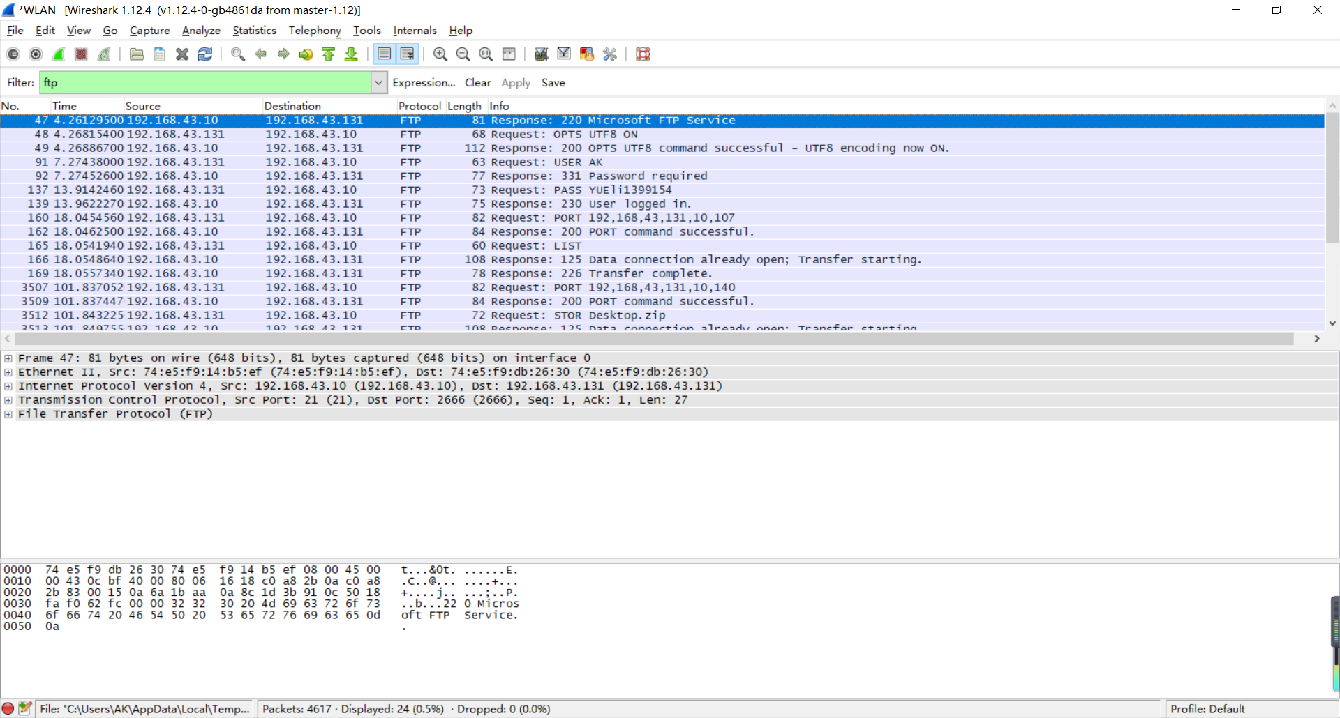 从上图可看出该用户登录FTP服务器的用户名是AK,密码是YUE13***