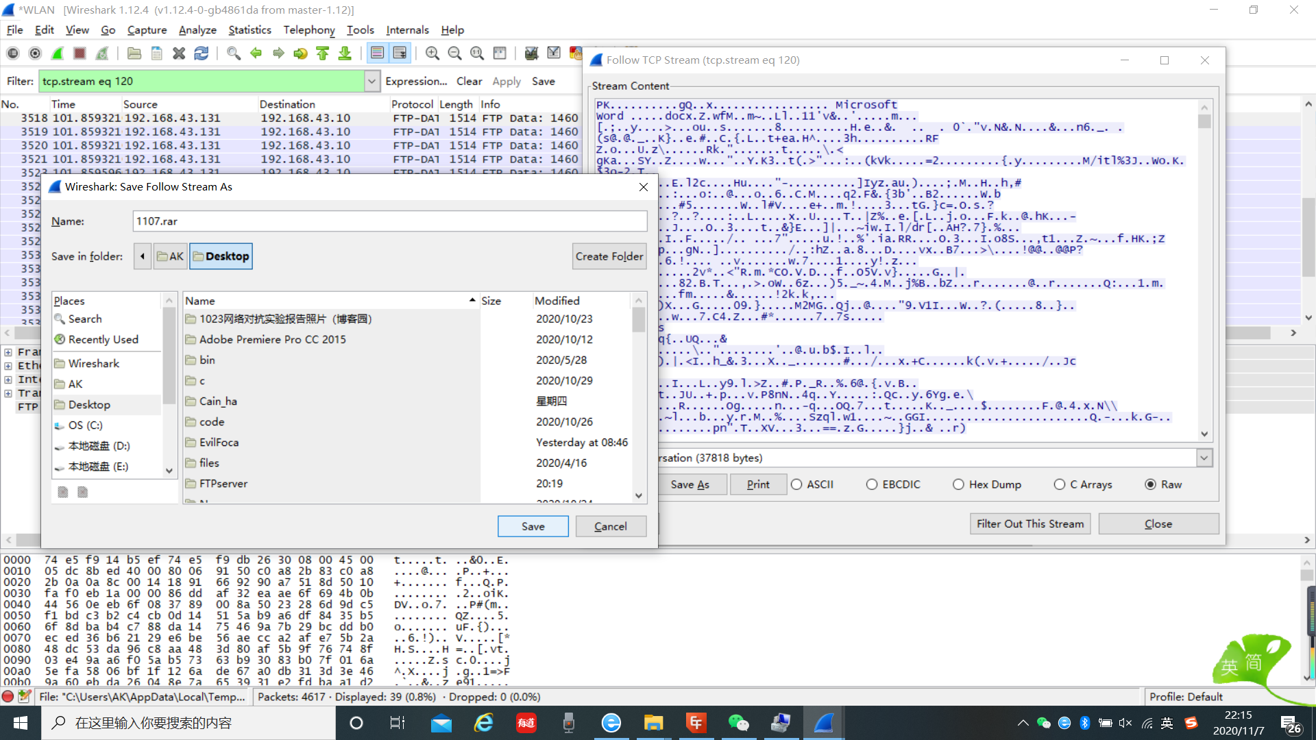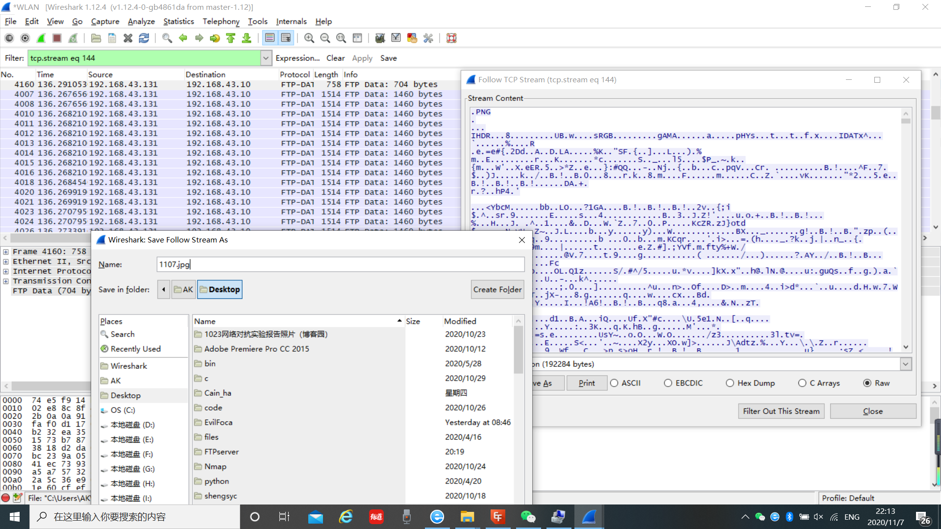 3.B同学在机器中安装Wireshark,并将其打开;之后用用户名和密码登陆A同学的FTP服务器,并上传一张图片和一个压缩包。
