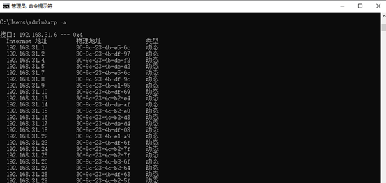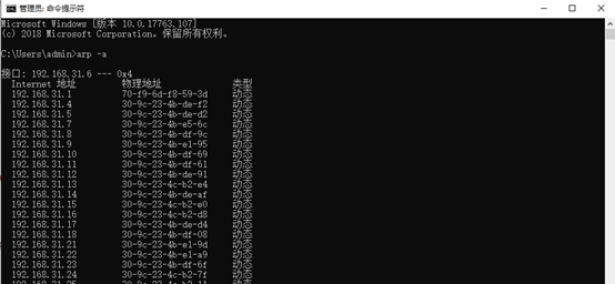 下图为欺骗开始后在192.168.31.6机器上用arp –a命令查询本机arp缓存表的情况,会发现缓存表中的网关对应的MAC地址变成了192.168.31.1号机(实施ARP欺骗的机器)的IP地址