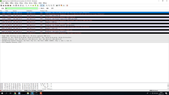 3.B同学在机器中安装Wireshark,并将其打开;之后用用户名和密码登陆A同学的FTP服务器,并上传一张图片和一个压缩包。