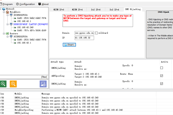 3.B同学扮演攻击者,设计攻击方法,使用CAIN,通过DNS欺骗的方式,让A同学访问www.ppsuc.edu.cn网址的时候,访问到另外一台机器上的伪造网站