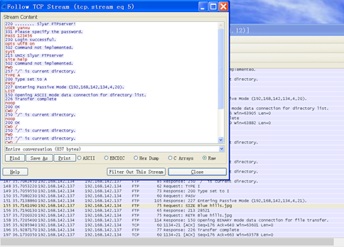 同学停止Wireshark抓包,并和A同学一起分析数据包中的FTP登录过程,还原登录用户名和密码,以及上传文件。