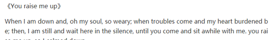 V2hlbiBJIGFtIGRvd24gYW5kLCBvaCBteSBzb3VsLCBzbyB3ZWFyeTsKV2hlbiB0cm91YmxlcyBjb21lIGFuZCBteSBoZWFydCBidXJkZW5lZCBiZTsKVGhlbiwgSSBhbSBzdGlsbCBhbmQgd2FpdCBoZXJlIGluIHRoZSBzaWxlbmNlLApVbnRpbCB5b3UgY29tZSBhbmQgc2l0IGF3aGlsZSB3aXRoIG1lLgpZb3UgcmFpc2UgbWUgdXAsIHNvIEkgY2FuIHN0YW5kIG9uIG1vdW50YWluczsKWW91IHJhaXNlIG1lIHVwLCB0byB3YWxrIG9uIHN0b3JteSBzZWFzOwpJIGFtIHN0cm9uZywgd2hlbiBJIGFtIG9uIHlvdXIgc2hvdWxkZXJzOwpZb3UgcmFpc2UgbWUgdXDigKYgVG8gbW9yZSB0aGFuIEkgY2FuIGJlLgpZb3UgcmFpc2UgbWUgdXAsIHNvIEkgY2FuIHN0YW5kIG9uIG1vdW50YWluczs=