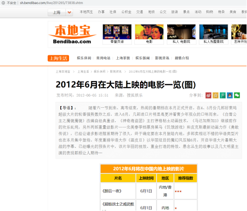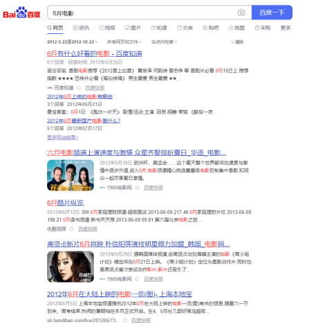 限制搜索范围为2012年5月22日到2012年10月22日,搜索“6月电影”