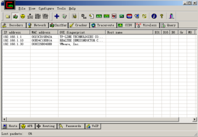 2、在192.168.31.144号机器上运行cain,选择要嗅探的网卡(单网卡,默认就可以)