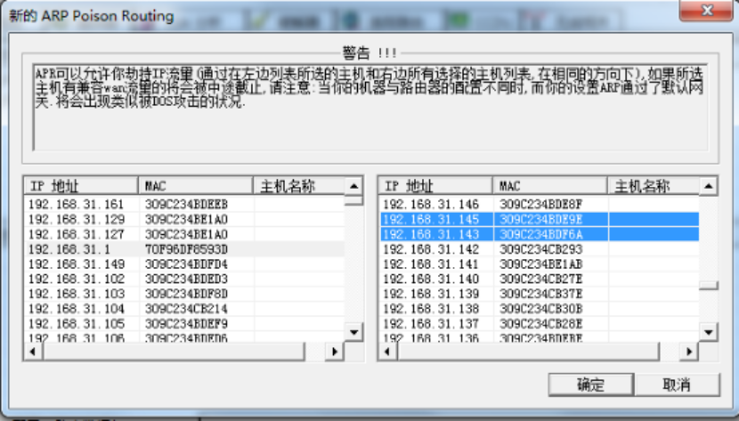 3、选中ARP页-》点下列表栏空白处,大加号变为可选-》点大加号,在弹出的窗口中选择要嗅探的目标主机(注意这里的选择和单击欺骗嗅探不一样,左面直接点网关,其它机器自动出现在右侧列表中,这时需要按住ctrl键在右侧选择你需要嗅探的主机,如图所示)