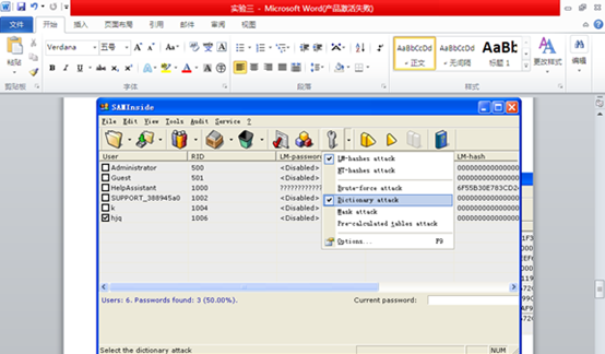 3.使用saminside软件将sam.txt导入,并进行破解,注意配置字典破解和暴力破解