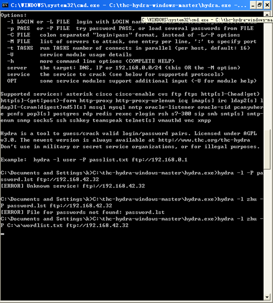 2.B同学使用hydra 对ftp用户的密码进行字典破解。hydra 中有关于该软件的使用命令语法。字典文件需要自己去生成。