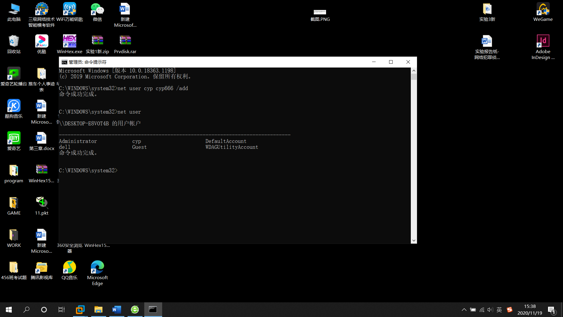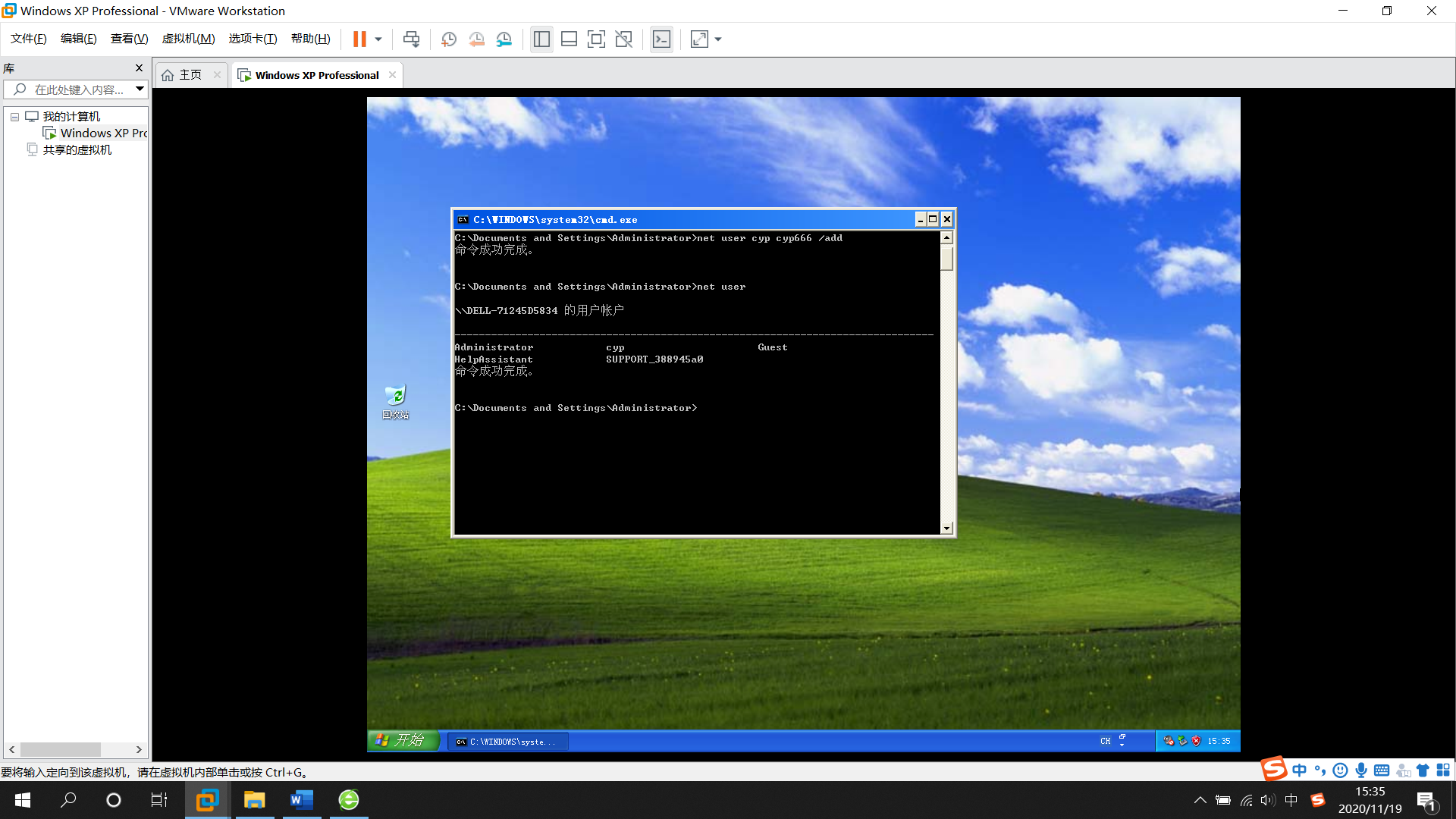 1.在windows xp系统中使用 net user gao gao123 /add添加用户gao,密码gao123的账户(用户名和密码可以自己设定);并使用net user命令确定用户添加成功。