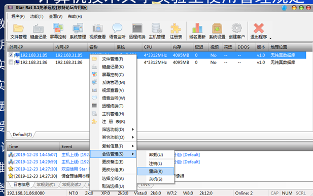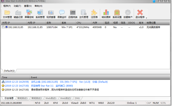 在控制端中查看木马上线情况,并对以下功能每个进行测试和截图。 【部分功能可能会无效,可以不用截图】