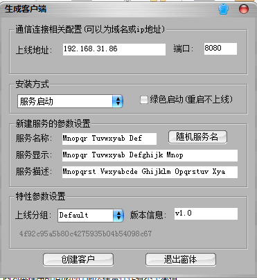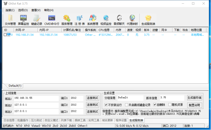 点击菜单栏中的“服务生成”,在弹出的配置服务端中,配置回连IP地址(攻击者IP)和端口号,并点击“生成”按钮,生成木马服务端。