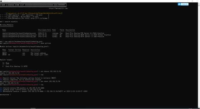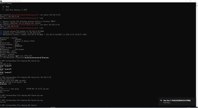 5.进入到meterpreter> 命令行下,说明已经获取到shell,可以使用sysinfo查看目标系统的信息,screenshot截屏。