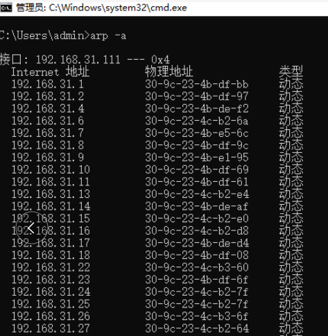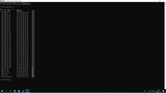 下图为欺骗开始后在192.168.31.111机器上用arp –a命令查询本机arp缓存表的情况,会发现缓存表中的网关对应的MAC地址变成了192.168.31.110号机(实施ARP欺骗的机器)的IP地址